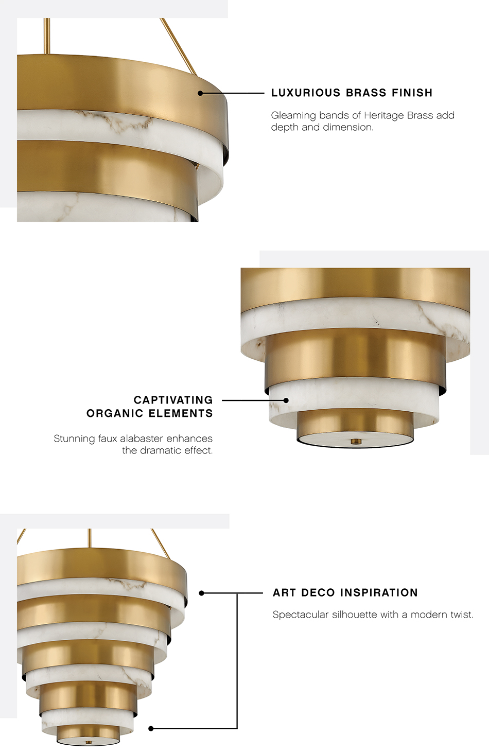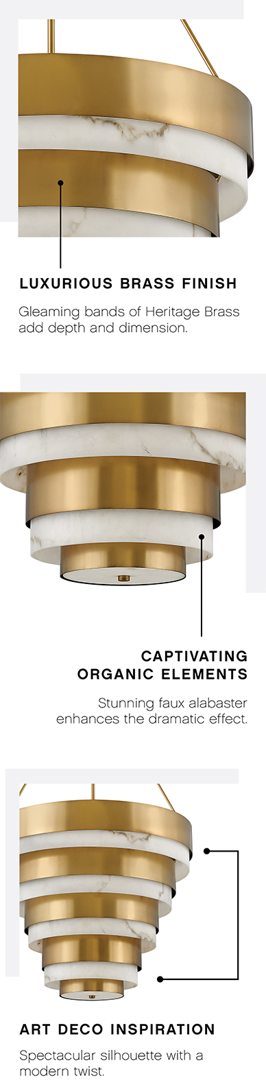 Throughout her travels, Lisa McDennon is constantly uncovering captivating styles and trends to incorporate throughout her designs. On a chance visit to downtown Detroit, Lisa was enthralled by the city’s historic skyline and its vibrant architectural legacy. Many of Detroit’s iconic buildings, constructed during the Roaring Twenties, are rich in Art Deco style. Lisa was immediately inspired to create Echelon: a dramatic, multi-tier chandelier from her innovative point of view.