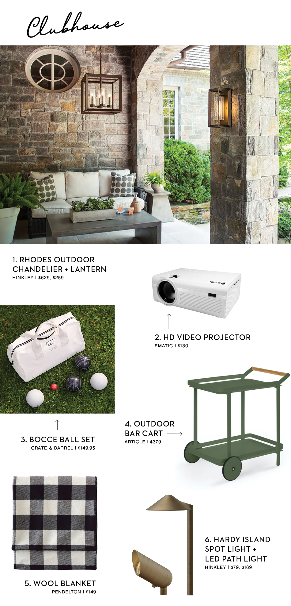 1. Hinkley Rhodes Chandelier, Lantern 2. Ematic Projector 3. Crate & Barrel Bocce Ball Set 4. Article Bar Cart 5. Pendelton Blanket 6. Hinkley Hardy Island Spot Light, Path Light