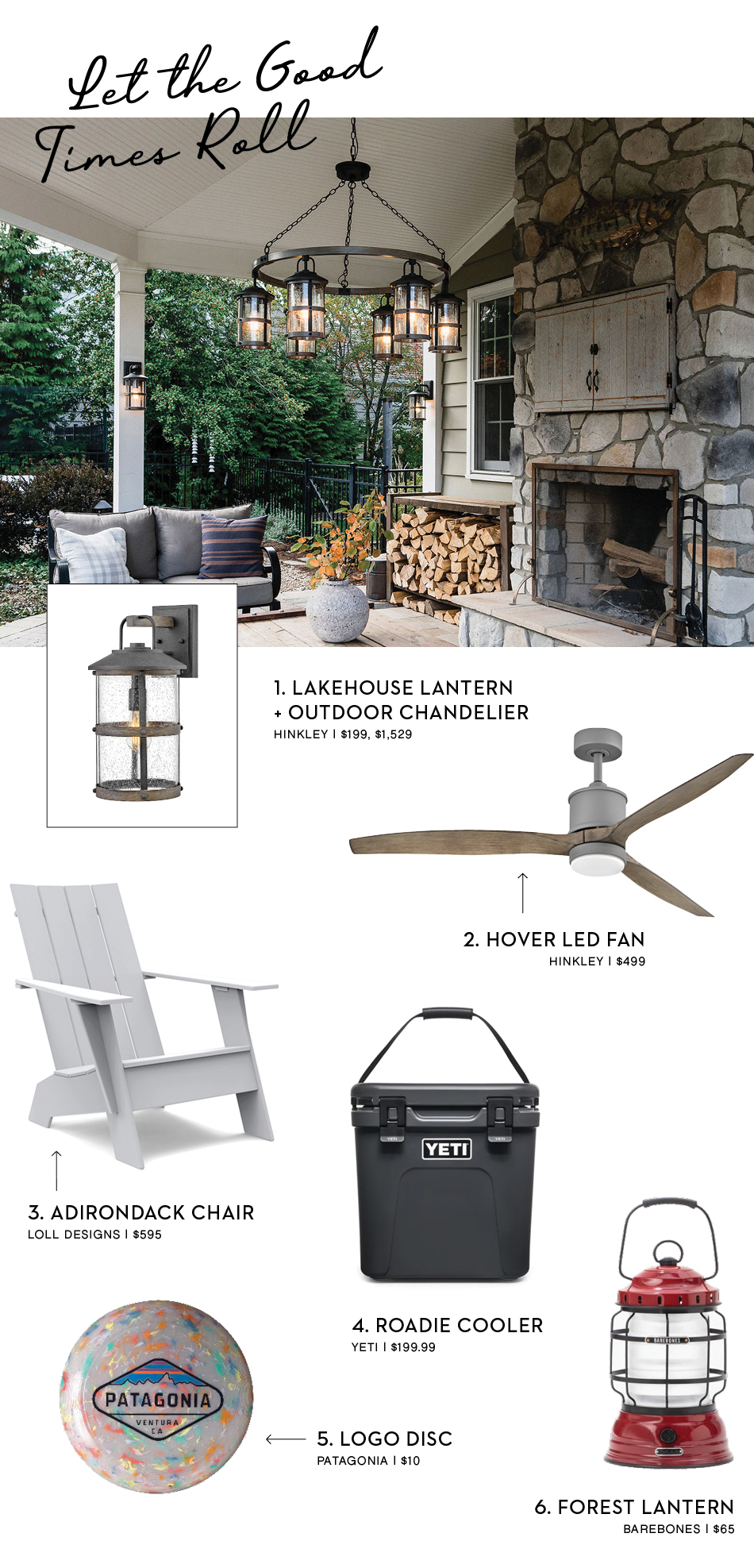 1. Hinkley Lakehouse Lantern, Chandelier 2. Hinkley Hover Fan 3. Loll Designs Adirondack 4. Yeti Cooler 5. Patagonia Frisbee 6. Barebones Lantern