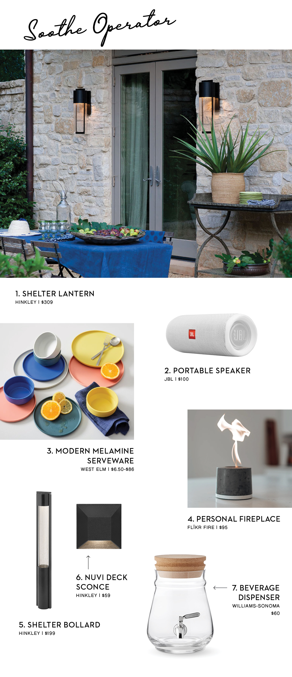1. Hinkley Shelter Lantern 2. JBL Portable Speaker 3. West Elm Serveware 4. Flikr Fire Fireplace 5. Hinkley Shelter Bollard 6. Hinkley Nuvi Deck Sconce 7. Williams-Sonoma Beverage Dispenser