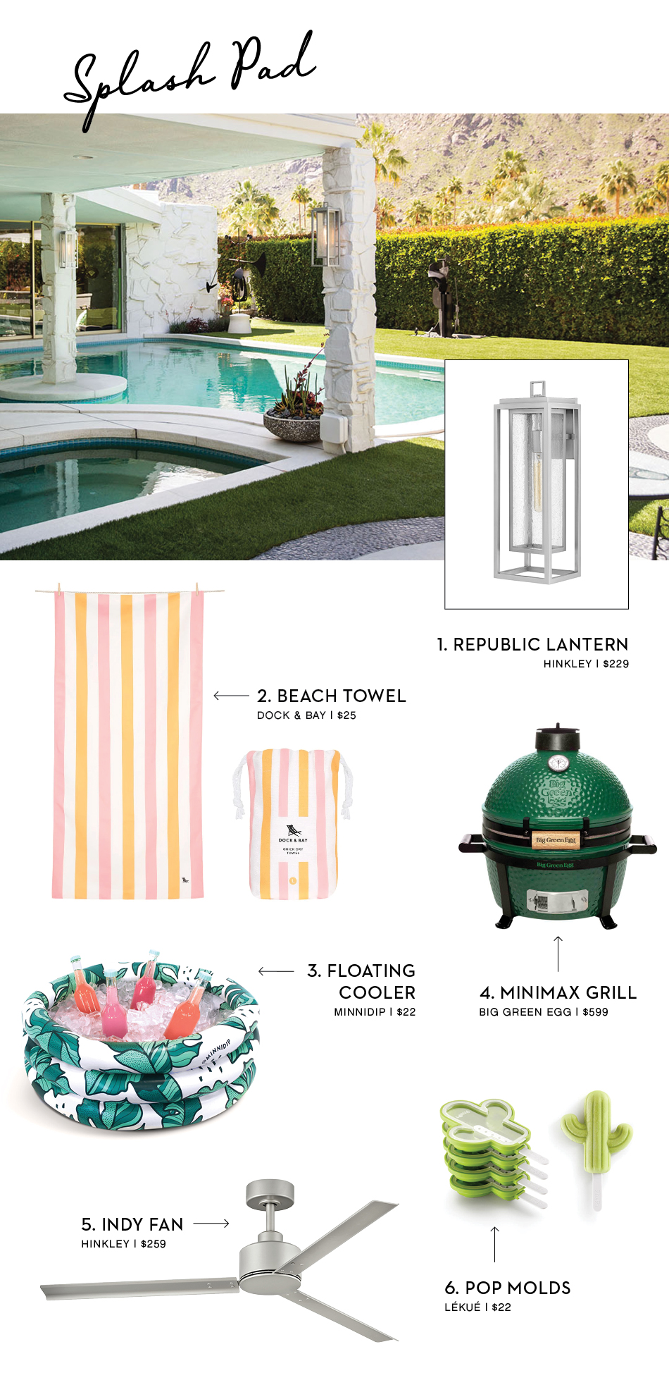 1. Hinkley Republic Lantern 2. Dock & Bay Beach Towel 3. MinniDip Floating Cooler 4. Big Green Egg Grill 5. Hinkley Indy Fan 6. Lékué Pop Molds